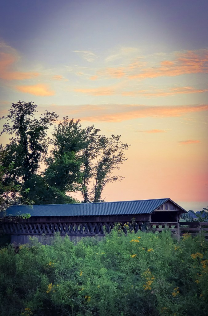 The Canal Greenway covered bridge stands alone, embracing an air of sadness as the sun descends over Hebron, Ohio.