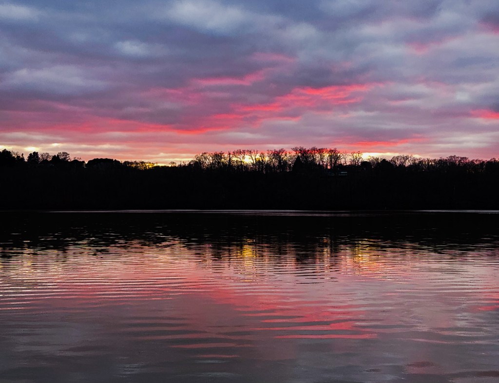 “The water was glassy and calm, still candy-colored in the after glow of sunset.”