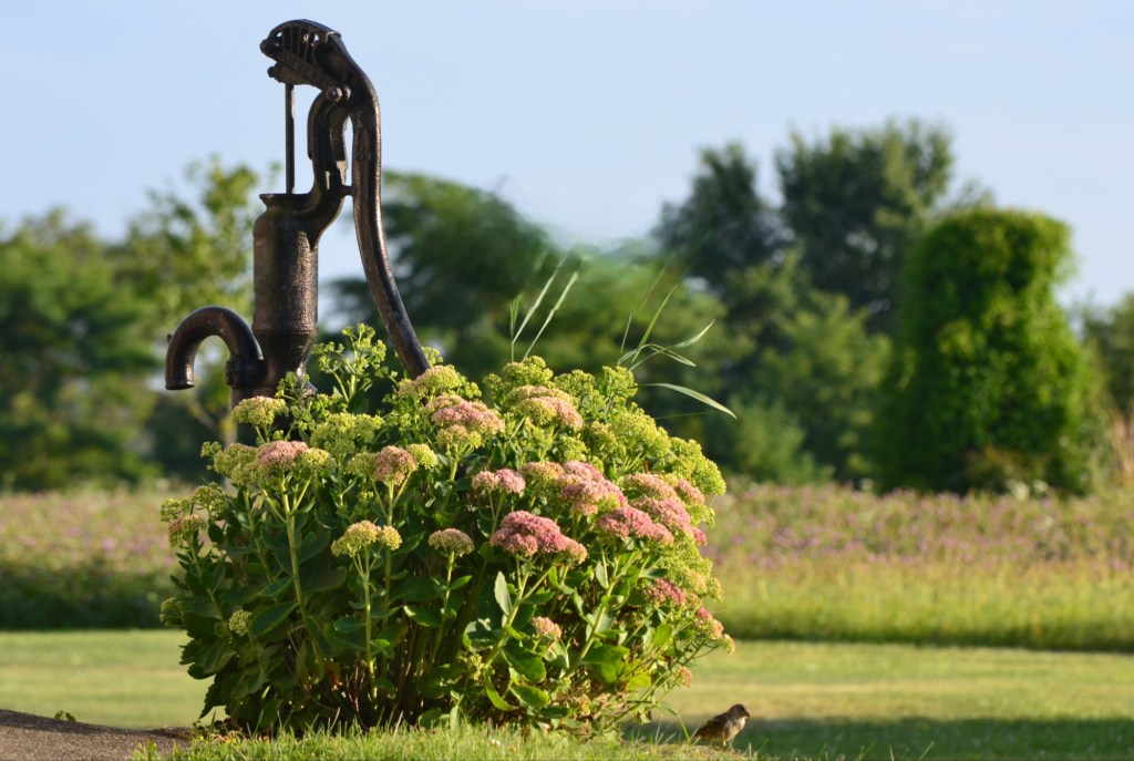 Weathered by countless seasons of use, the old water pump enjoys the tender embrace of fragrant color in the evening summer sun…