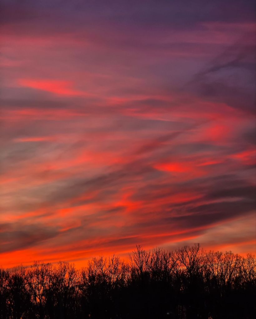 In a symphony of blazing passion, streaks of crimson and violet intertwine—like lovers irresistibly drawn by fate’s design, their souls merging in a celestial embrace…