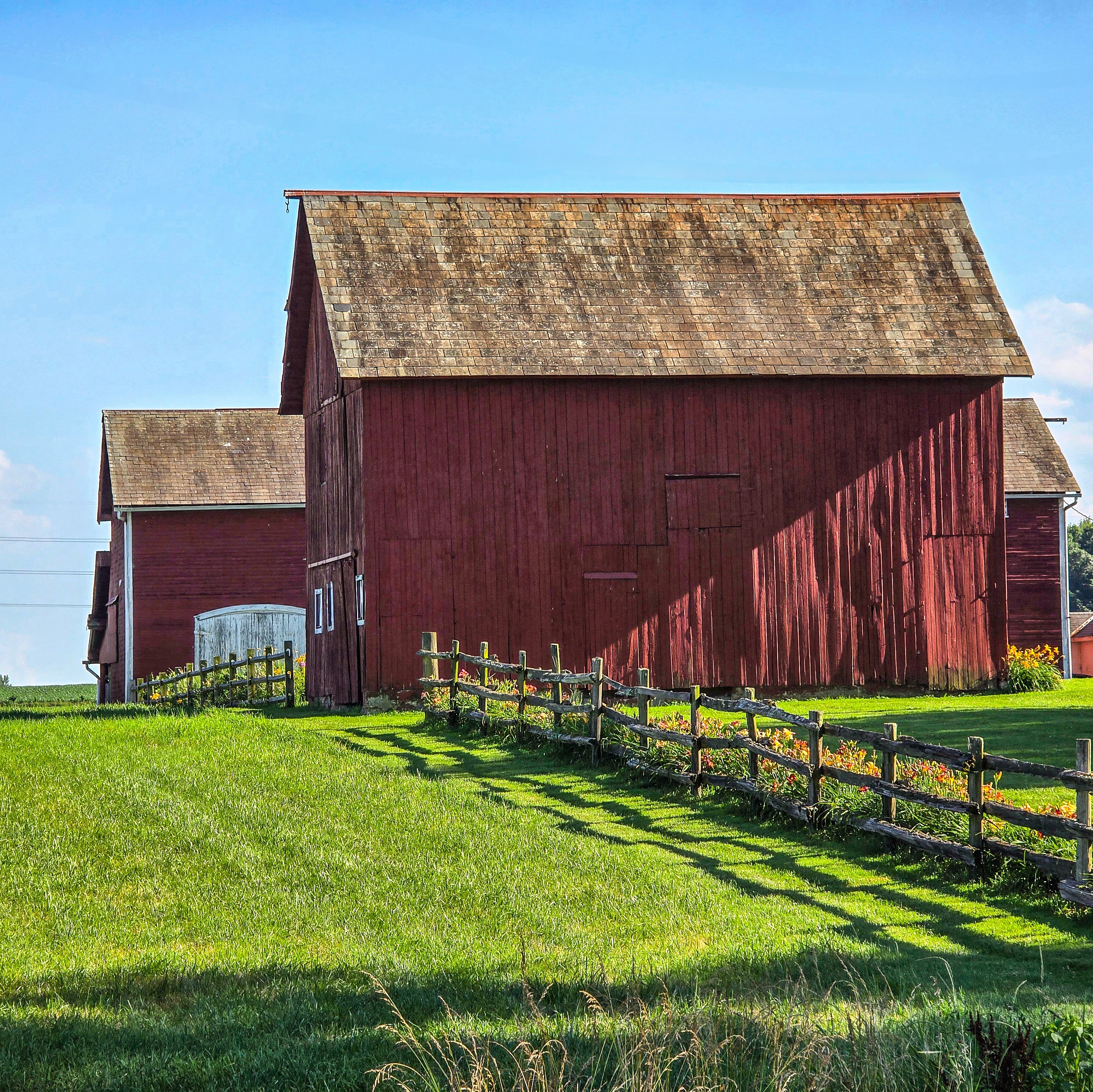 Standing quietly beneath summer’s gaze, her weathered boards proudly proclaim a storied past, as she basks in the afternoon’s warmth. A guardian over nature’s blooms, now clustered along her fence line, drawn to her aged charm—a gentle pull that keeps old secrets and the sun’s soft touch…