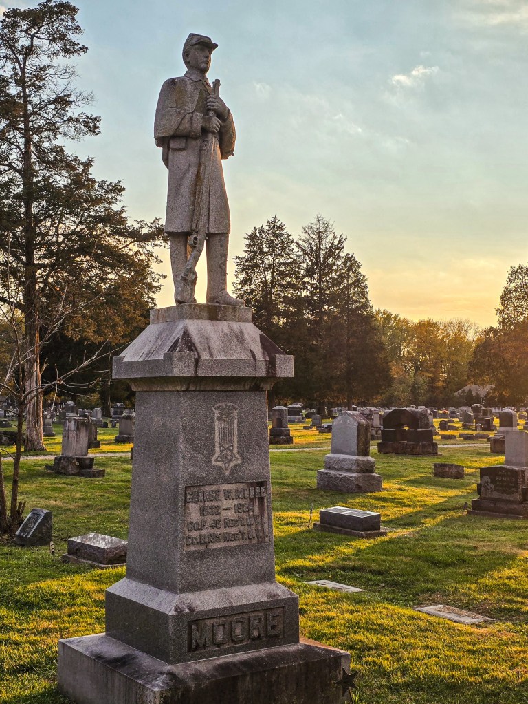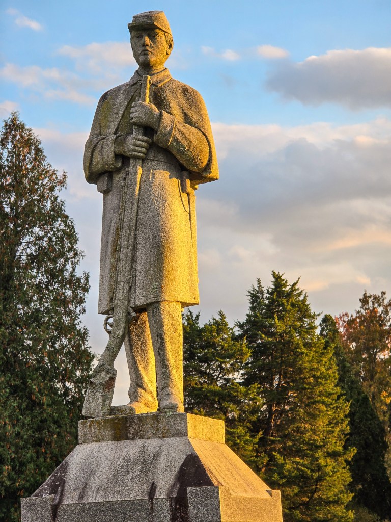 In golden light of evening blaze, the old sentry meets our gaze. From cannon’s breath and bitter fray, to Pataskala’s peaceful quiet way. He catches fire in the evening sun, a soldier’s watch that’s never done. Carved in stone for one man’s name, to guard the peace from which he came…